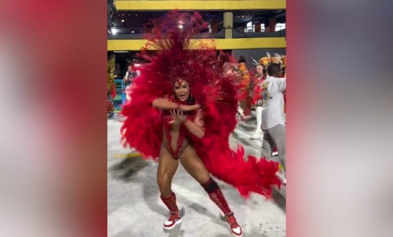 Agora, o detalhe que todo mundo notou: Graciane apareceu desfilando de tênis. E não foi “look aleatório”, tá? Ela já vinha usando tênis nos ensaios, e tem motivo: a Graciane fez cirurgia no joelho e não pode forçar com salto alto. Então a fantasia dela já estava preparada pra isso, justamente pra não arriscar.